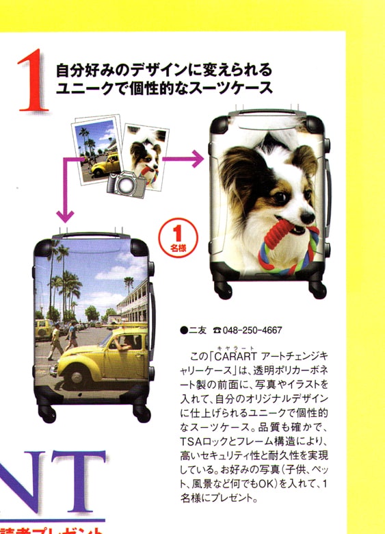 ホームお知らせ雑誌 特選街4月号で「キャラート」が紹介されました。 雑誌 特選街4月号で「キャラート」が紹介されました。 2011-03-09 人気トレンドアイテム雑誌「特選街」(マキノ出版)4月号(3月3日発売)にユニークで個性的なスーツケースとして弊社「キャラート」が紹介されています!書店などにお立ち寄りの際は是非ご覧になってください!(146ページ)